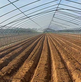 現地では、すでに圃場の耕起作業が完了し、ハウス栽培をするために畑の状態も整えられていました。土壌は適度に湿り気を帯びており、播種には良好な条件がそろっています。整然とした畝(うね)が並ぶ畑は、秋作に向けた万全の準備が進んでいることを物語っています。