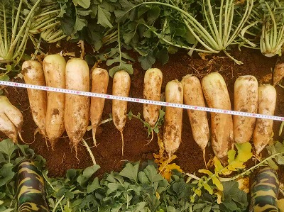 一部の畑では いつもより大根が少し短めですが、病害虫による大きな被害はなく、しっかりと育っています。大根の長さに差が出た原因として、畑の耕しが浅かったところでは土が硬いため、大根が短く育ってしまったようです。
