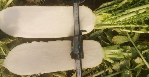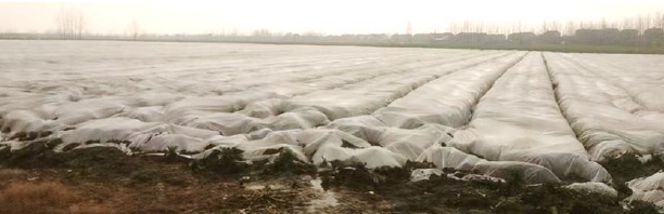 湖北省の冬は、最低気温が一気に下がる日が多く、雪が少なくても地表が凍結ことがあります。水分の多い品種の大根は凍ってしまい、身が柔らかくなってしまうこともあるようです。しかし不織布で覆われていた畑では、雪や凍結によるダメージもなく順調に生育しているようです。